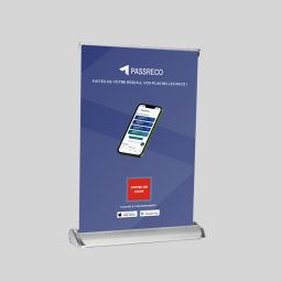 Le mini roll-up Passreco (roll-up de table) est le support idéal pour capter l’attention dans les espaces réduits : bureaux, comptoirs, tables de rendez-vous, salons ou événements professionnels.